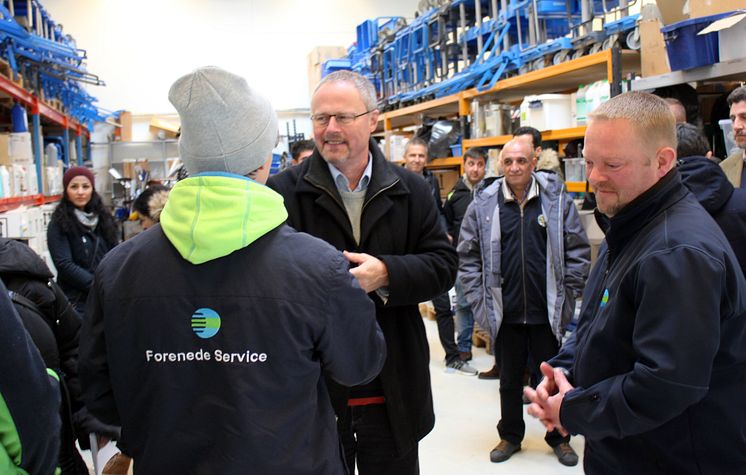 Skanderborgs borgmester Jørgen Gaarde (S) hilser her på et par af medarbejderne i Forenede Service i forbindelse med virksomhedsbesøget på lokale virksomheder.