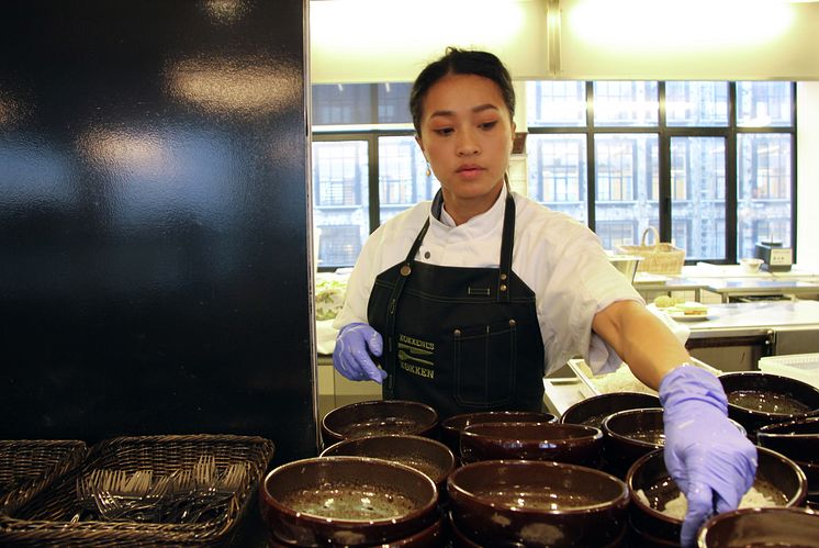 De nye flotte kokkeuniformer består af brugte engangs-plastikflasker, der renses, nedbrydes, smeltes og laves til tekstilfibre/garn, som gør tøjet mere holdbar.