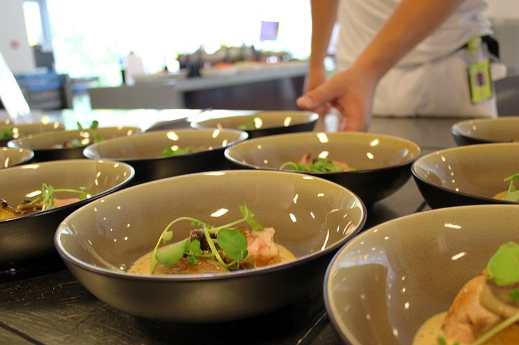 De faguddannede kokke fra kantineleverandøren Kokkenes Køkken leverer mad til flere og flere virksomheder og kontorhuse. Og ofte som her på billedet bliver retterne portionsanrettet til gæsterne.