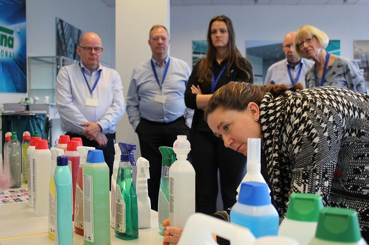 De nye grønne rengøringsmidler nærstuderes af Forenede Service-medarbejder