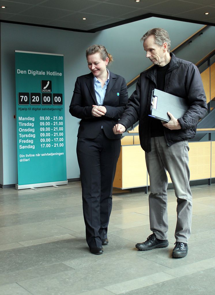 De to falder med det samme i en god faglig samtale ligeså snart de mødes. Selvom det ikke er dagsordenen for mødet giver det flotte gulv i forhallen på Favrskov Rådhus nemlig anledning til en snak imellem controller i Favrskov Kommune Bendix Sørensen og serviceleder i Forenede Service Katrine Hilmar Precht Christensen om, hvordan gulvet kan blive endnu flottere.