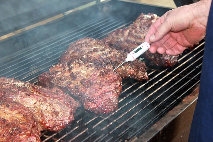 Intet er overladt til tilfældighederne, når de to kyndige grillherrer fra Kokkenes Køkken håndterer kød på grillen. Temperaturen på kødet skal naturligvis være korrekt.