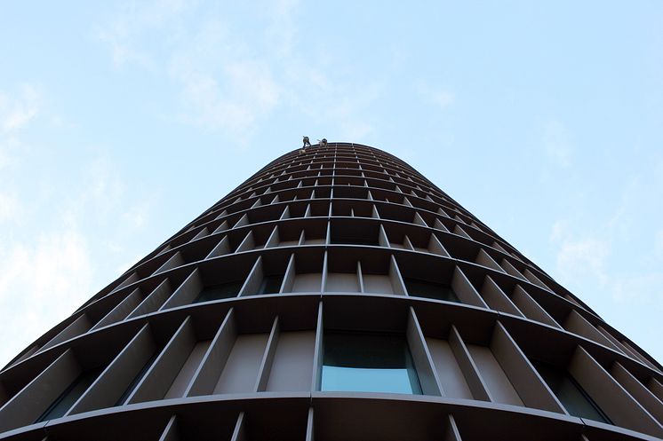Axel Towers er 61 meter høj. Her er arbejdsklatrerne netop hejst sig ud over kanten.