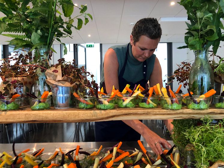 Direktøren i Kokkenes Køkken, Maj Toppenberg, ser i fuld gang med at finjustere en udgave af det nye kantinekoncept kaldet SANS!.