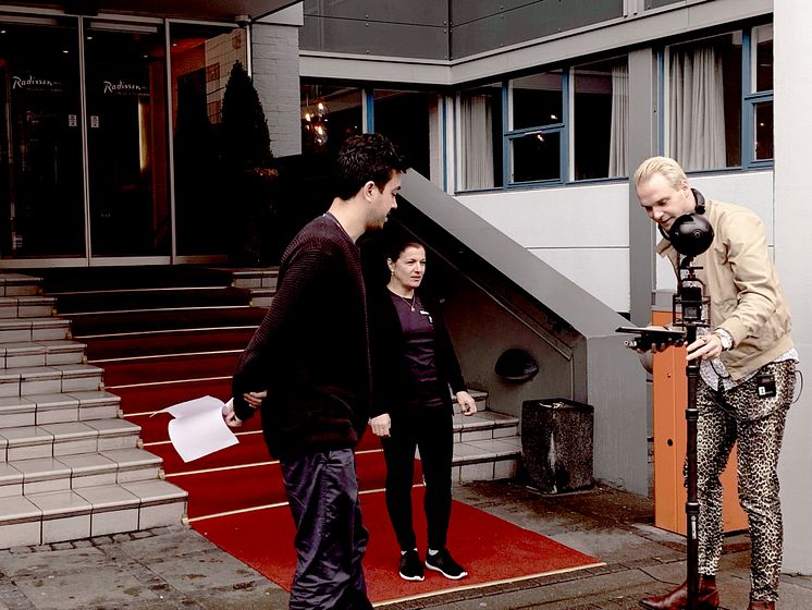 Khora-personalet og Forenede Hotelservice-medarbejder Manij Ahmedpoor i gang med virtual reality-shoot. Målet er at sammensætte en præsentation af Manijs historie og gode råd til andre flygtninge, der kommer til Danmark.