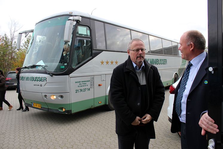 Vice- og regionsdirektør Ejnar Olsen (til højre i billedet) byder her Skanderborgs borgmester Jørgen Gaarde (S) og de 15 flygtninge velkommen til virksomhedens lokaler i Tilst.