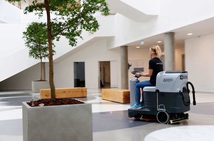 Den familieejede og dansk-baserede rengøringsvirksomhed Forenede Service gør rent i hele Danmark for såvel private som offentlige kunder. Her en situation fra det nyopførte sundhedshus "Center for Sundhed" i Holstebro.