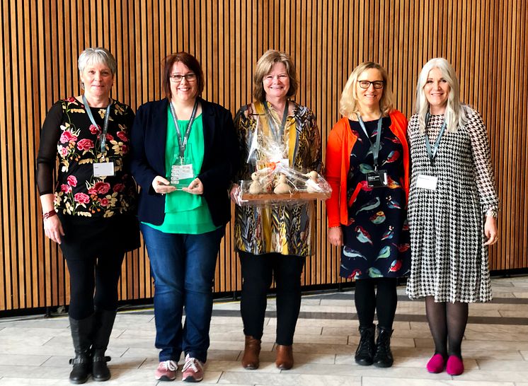 Tre glade vindere fra Vejle ses fra venstre på billedet; Rengørings-controller Pia Sjødahl, projektleder Kristinna Andersen og rengørings-controller Lene Kristensen, Vejle Kommune Digitalisering og analyse. Derefter Majbritt Frødstrup, formand for IKA’s Dialogpris ved siden af salgs- og tilbudschef i Forenede Service Chalotte Stahl yderst til højre.