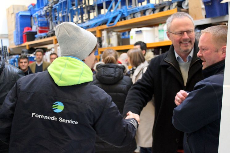 Der var en god stemning på lageret hos Forenede Service i Tilst. Her hilser Skanderborgs borgmester Jørgen Gaarde (S) på nogle af virksomhedens medarbejdere.