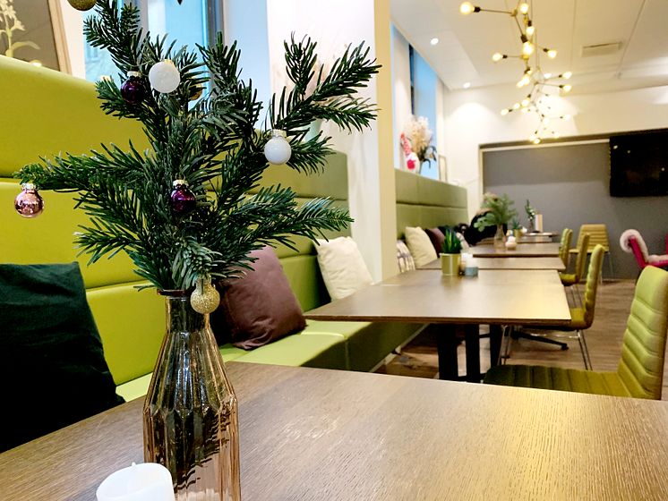 December kalder på gran, kogler og kugler i alverdens afskygninger - også i medarbejdercafeen hos Vibenshuset, hvor der juletraditionen tro er pyntet op. Selv kaffen har fået en facelift - hele december kan medarbejderne nyde en julelatte med hjemmelavet sirup af nelliker, kanel og kardemomme.