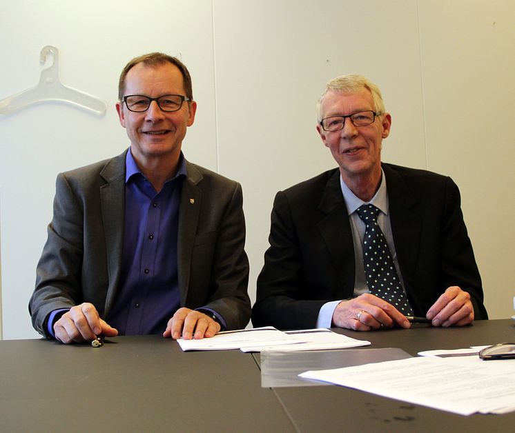 Forenede Service har netop indgået en aftale om at varetage Haderslev Kommunes rengøringsopgaver fra 1. marts 2015 og tre år frem. På billedet ses til venstre borgmester Hans Peter Geil (V) og Vicedirektør i Forenede Service Flemming Sindberg.