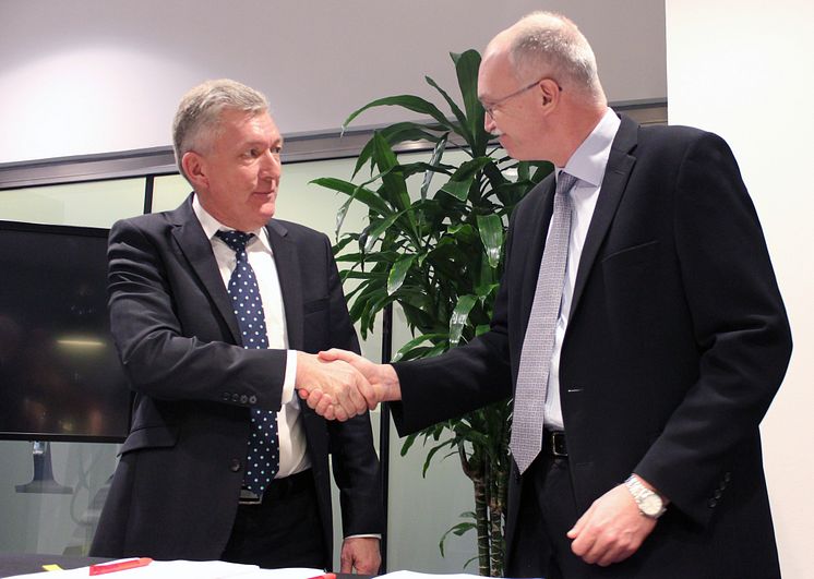 Rektor på DTU Anders Overgaard Bjarklev og Regionsdirektør i Forenede Service Jan Jeppesen lykønsker hinanden med aftalen