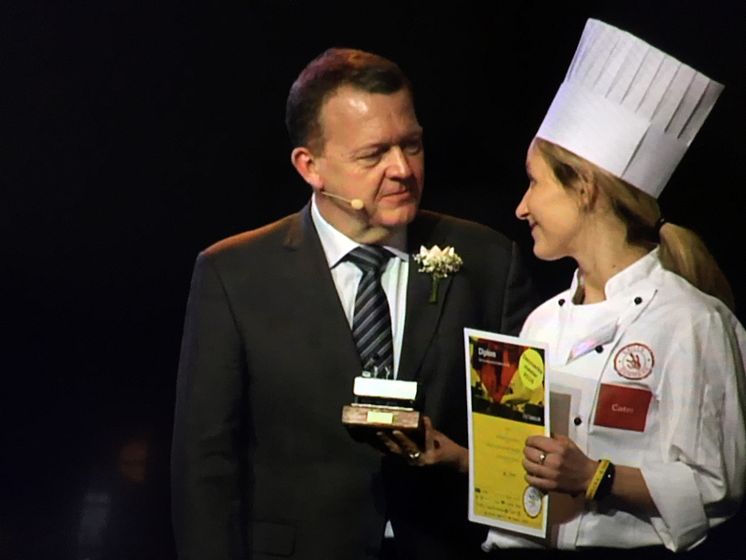 Statsminister Lars Løkke Rasmussen overrækker Kathrine Højgaard Pedersen præmie og diplom