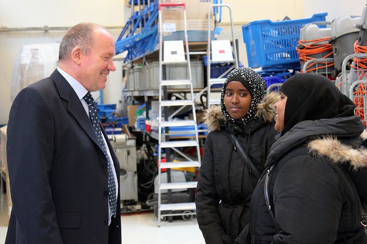 Vicedirektør i Forenede Service Ejnar Olsen ses her i dialog med flygtninge, som er bosiddende i Skanderborg.