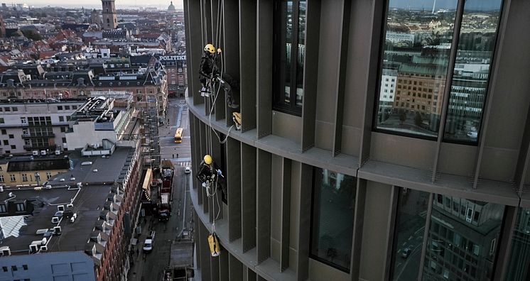 Alt imens byens borgere knapt er vågnet, ses arbejdsklatrerne, som er tilknyttet TJEK Ejendomsservice i fuld gang med at polere vinduespartierne på Axel Towers.