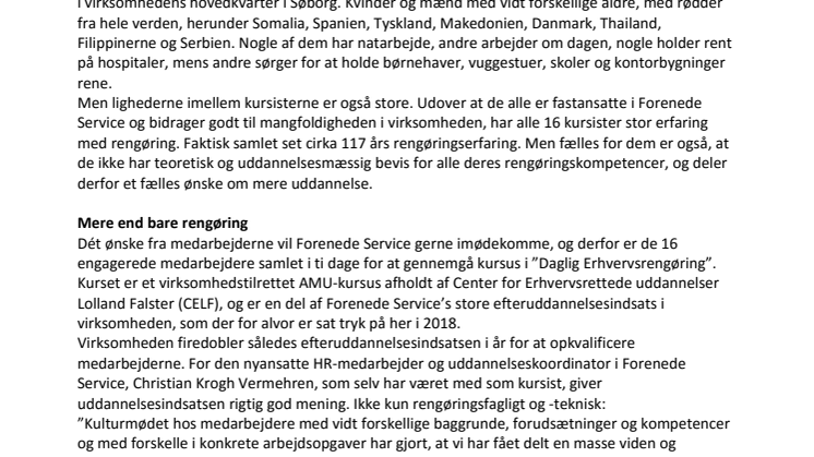 Dét ønske fra medarbejderne vil Forenede Service gerne imødekomme, og derfor er de 16 engagerede medarbejdere samlet i ti dage for at gennemgå et kursus i ”Daglig Erhvervsrengøring”. Kurset er et virksomhedstilrettet AMU-kursus afholdt af Center for Erhvervsrettede uddannelser Lolland Falster (CELF), og er en del af Forenede Service’s store efteruddannelsesindsats i virksomheden, som der for alvor er sat tryk på her i 2018.