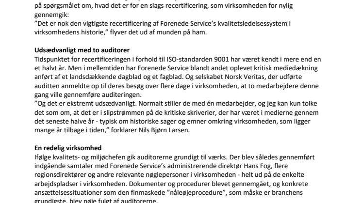 Tidspunktet for recertificeringen i forhold til ISO-standarden 9001 har været kendt i mere end en et halvt år. Men i mellemtiden har Forenede Service blandt andet oplevet kritisk mediedækning anført af et landsdækkende dagblad og et fagblad. Og selskabet Norsk Veritas, der udførte auditten anmeldte op til deres besøg over flere dage i virksomheden, at to medarbejdere denne gang ville gennemføre auditeringen.