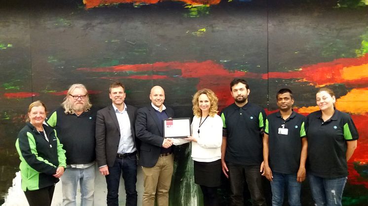 Glade prisvindere. CSR-certifikatet blev overleveret til Forenede Service i slutningen af året af Henrik Bugge og Mette Nielsen fra Jobcenter Randers ved en seance på virksomheden Tradium, som er en af Forenede Service’s kunder. På billedet ses fra venstre serviceassistent Jette Jørgensen, serviceassistent Ib Asmussen, serviceleder, Johannes Arentzen, driftschef Jesper Rasmussen, Mette Nielsen fra Jobcenter Randers, Hossam, der er praktikant i Forenede Service, serviceassistent Siva Tharma Corleis og praktikant Alma Handanagic.
