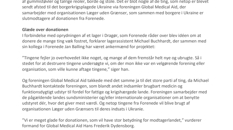 Og foreningen Global Medical Aid takkede med det samme ja til det store parti af ting, da Michael Buchhardt kontaktede foreningen, som blandt andet indsamler brugbart medicin og funktionsdygtigt udstyr til fordel for fattige og krigshærgede lande. Foreningen samarbejder med de pågældende landes sundsministerier og/eller internationale organisationer om at benytte udstyret dér, hvor det giver mest værdi. Og netop tingene fra Forenede vil blive brugt af organisationen Læger uden Grænsers til deres indsats i Ukranie.