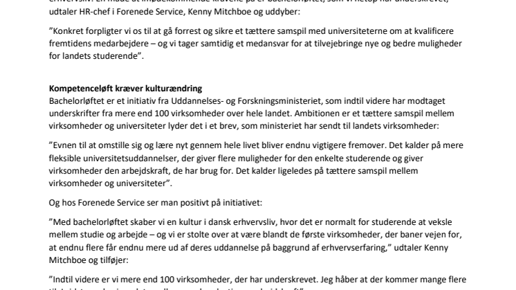 ”I vores branche oplever vi et stadigt stigende kompetencekrav til medarbejderstaben fra omverden og erhvervsliv. En måde at imødekommende kravene på er bachelorløftet, som vi netop har underskrevet," forklarer HR-chef i Forenede Service, Kenny Mitchboe og uddyber: