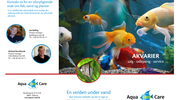 ”Man behøver ikke som kunde at sætte sig ind i akvarie- og fiskeplejen. Det sørger vi for og sikrer, at akvariet altid har en vis høj standard. Kunderne kan sådan set bare læne sig tilbage og nyde oplevelsen ved at have akvariefiskene stående og samtidig profitere af alle de gavnlige sideeffekter, der er ved at have dyr i nærheden af mennesker,” siger Jan Balling og nævner, at Aqua-Care kan tilbyde forskellige pakkeløsninger til kunderne, hvor man både kan vælge at købe eller leje akvarierne til konkurrencedygtige priser. En pasningsordning løber minimum et år.