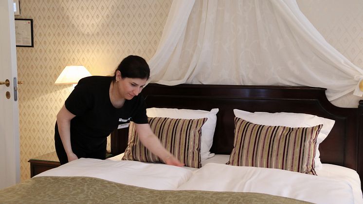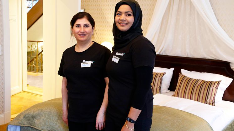 ”Vi har et godt samarbejde med jobcentre rundt omkring i landet og gode erfaringer med at tage flygtninge i praktik og sidenhen ansætte dem i faste stillinger. De ender med at blive nogle rigtig gode medarbejdere, som vi er meget glade for,” siger driftschef i Forenede Hotelservice Mie Jacobsen. Hun var inde over ansættelsen af Rokan Hamo og Razan Odavan.