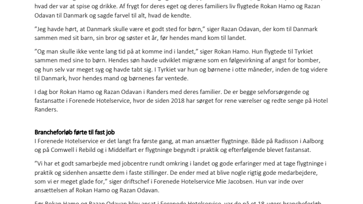 Rokan Hamo og Razan Odavan kom til Danmark for fem år siden som flygtninge fra Syrien. I dag er de begge fastansatte i Forenede Hotelservice som medhjælpere på Hotel Randers. Og netop det at få et arbejde er deres bedste råd til andre flygtninge, der kommer til Danmark.