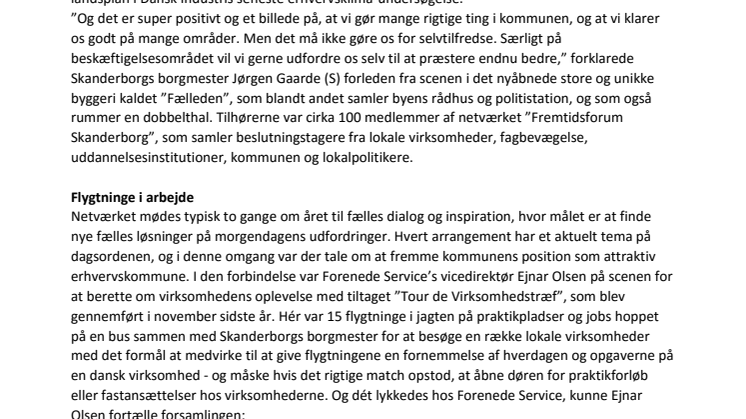 Netværket mødes typisk to gange om året til fælles dialog og inspiration, hvor målet er at finde nye fælles løsninger på morgendagens udfordringer. Hvert arrangement har et aktuelt tema på dagsordenen, og i denne omgang var der tale om at fremme kommunens position som attraktiv erhvervskommune. I den forbindelse var Forenede Service’s vicedirektør Ejnar Olsen på scenen for at berette om virksomhedens oplevelse med tiltaget ”Tour de Virksomhedstræf”, som blev gennemført i november sidste år. Hér var 15 flygtninge i jagten på praktikpladser og jobs hoppet på en bus sammen med Skanderborgs borgmester for at besøge en række lokale virksomheder med det formål at medvirke til at give flygtningene en fornemmelse af hverdagen og opgaverne på en dansk virksomhed - og måske hvis det rigtige match opstod, at åbne døren for praktikforløb eller fastansættelser hos virksomhederne. Og dét lykkedes hos Forenede Service, kunne Ejnar Olsen fortælle forsamlingen: