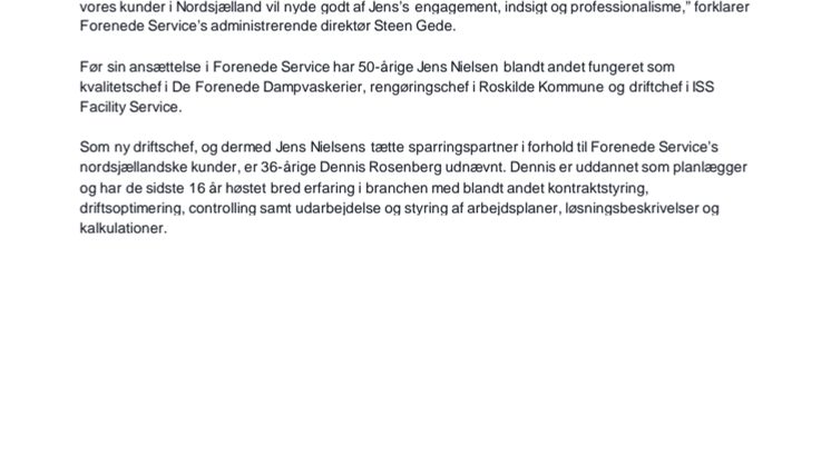 Før sin ansættelse i Forenede Service har 50-årige Jens Nielsen blandt andet fungeret som kvalitetschef i De Forenede Dampvaskerier, rengøringschef i Roskilde Kommune og driftchef i ISS Facility Service.