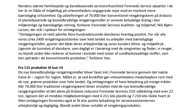 Nordens største familieejede og danskbaserede servicevirksomhed Forenede Service søsætter i de her år en flåde af miljøtiltag på virksomhedens engagerede rejse mod en markant mere bæredygtig virksomhed. Og udskiftningen af 70.000 liter konventionel rengøringskemi på årsbasis til plantebaserede og bionedbrydelige rengøringsmidler er seneste betydelige åretag i den miljøvenlige og bæredygtige retning, forklarer Forenede Services kvalitets- og miljøchef, Nils Bjørn Larsen, der står i spidsen for omlægningen: