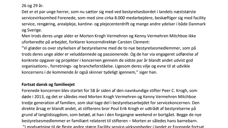 ”I modsætning til de fleste andre større Facility service-virksomheder i landet er Forenede fortsat familieejet og dansk baseret. Og det er en stor glæde for ejerkredsen bag og ledelsen i koncernen, at de to unge mænd er oprigtigt interesserede i at medvirke til at videreføre og udvikle koncernen,” siger Carsten Clement.