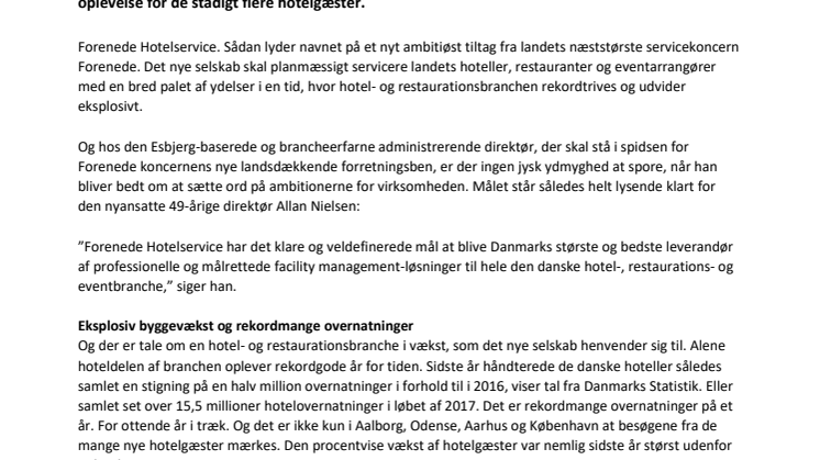 Forenede Hotelservice. Sådan lyder navnet på et nyt ambitiøst tiltag fra landets næststørste servicekoncern Forenede. Det nye selskab skal planmæssigt servicere landets hoteller, restauranter og eventarrangører med en bred palet af ydelser i en tid, hvor branchen rekordtrives og udvider.