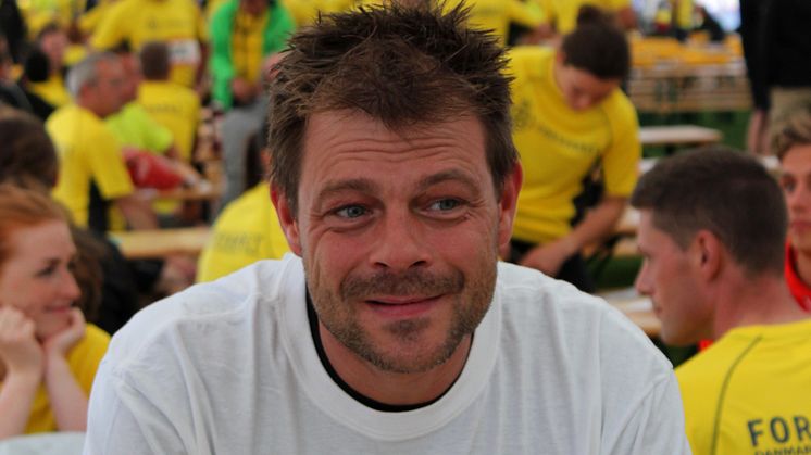 ”Næste år skal tiden gerne ned under 30 minutter,” siger han og rejser sig fra bænken i Fælledparken for at nå at kunne heppe på sidste løber på hans hold i DHL-stafetten.
