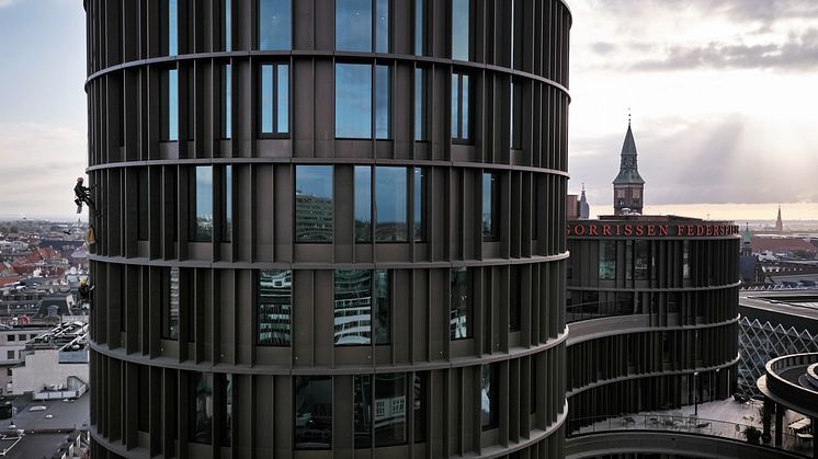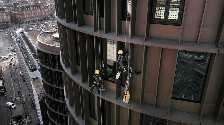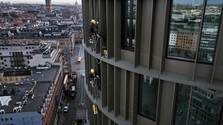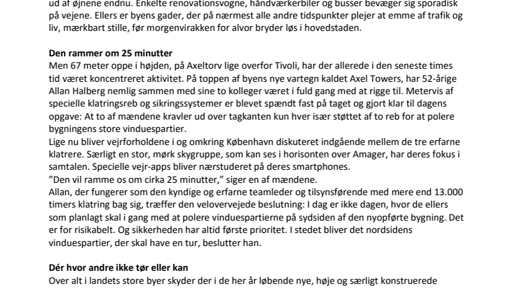 Men 67 meter oppe i højden, på Axeltorv lige overfor Tivoli, har der allerede i den seneste times tid været koncentreret aktivitet. På toppen af byens nye vartegn kaldet Axel Towers, har 52-årige Allan Halberg nemlig sammen med sine to kolleger været i fuld gang med at rigge til. Metervis af specielle klatringsreb og sikringssystemer er blevet spændt fast på taget og gjort klar til dagens opgave: At to af mændene kravler ud over tagkanten kun hver især støttet af to reb for at polere bygningens store vinduespartier.