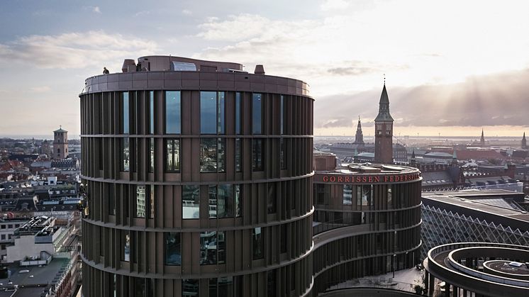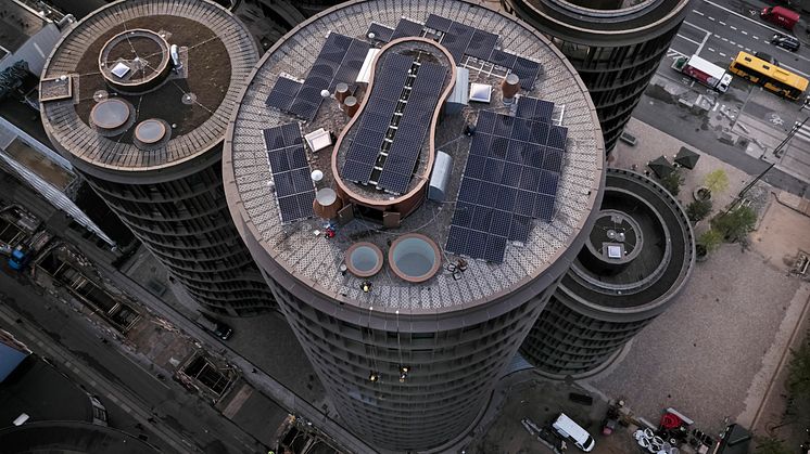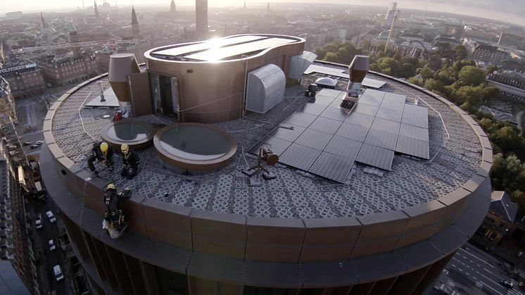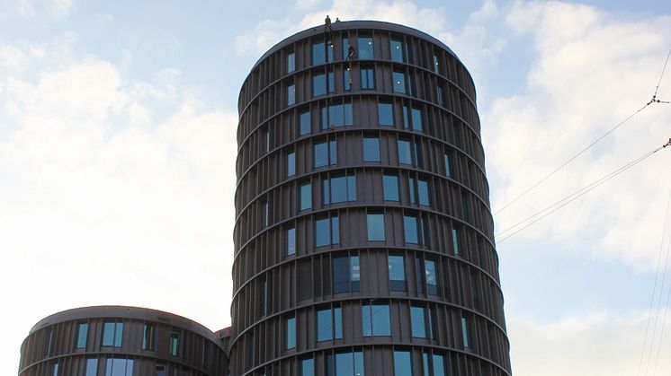 På TJEK Ejendomsservices Facebook-profil kan du se en kort videofilm af klatrenes arbejde på Axel Towers - optaget fra en drone .