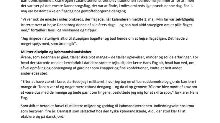 Årene, som sidenhen er gået, tæller ikke blot mange – de tæller oplevelser, minder og solide erfaringer. For hvad der startede med et læreforløb i datidens største tøjbutik, der lærte Hans Fog alt, hvad han ved, om såvel opmåling og ophængning af gardiner som knapper og fine konfektioner, endte et helt andet anderledes sted: