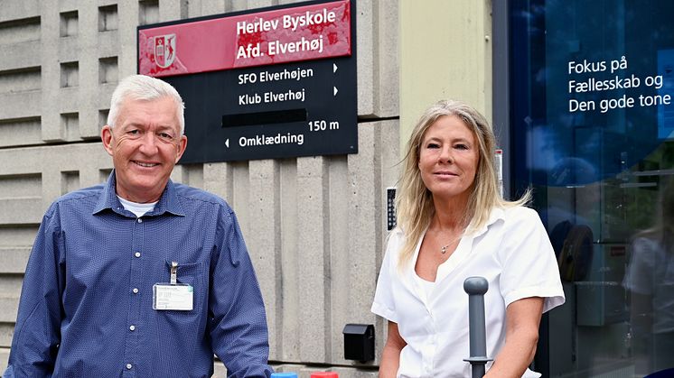 Foto fra Herlev Byskole, hvor Jan Jeppesen, regionsdirektør og Linette Mathiesen, driftschef i Forenede Service er i gang med at sikre, at alle rengøringsmidler og vogne er på plads.