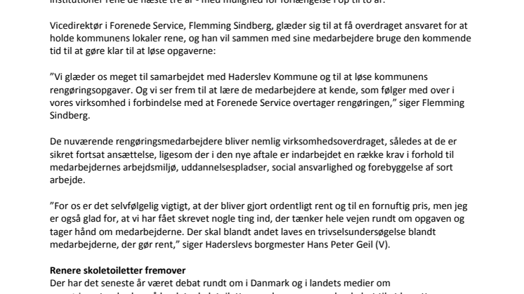 ”Vi glæder os meget til samarbejdet med Haderslev Kommune og til at løse kommunens rengøringsopgaver. Og vi ser frem til at lære de medarbejdere at kende, som følger med over i vores virksomhed i forbindelse med at Forenede Service overtager rengøringen,” siger Flemming Sindberg.