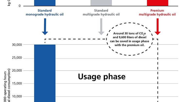 Resultaterne viser, at hydraulikolien med den høje kvalitet sparer cirka 9.600 liter diesel i løbet af en anvendelsesfase på 8.000 driftstimer. Dette svarer ikke blot til en CO₂-ækvivalent på cirka 30 ton, men indebærer også reducerede omkostninger til dieselbrændstof på cirka 90.000 kroner! Samtidig viste den forbedrede levetid, at forbruget af hydraulikolie falder betydeligt i de 8.000 driftstimer, fra 1.600 liter (Standard monograde) til 400 liter (Premium multigrade), og at også vedligeholdelsesintervallet kunne forlænges.