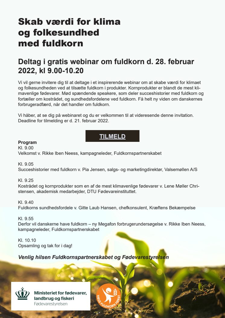 Fuldkornspartnerskabet inviterer til et inspirerende gratis webinar om at skabe værdi for klima og folkesundhed med fuldkorn.