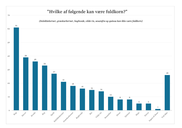 Mange danskere har svært ved at nå op på de 75 gram fuldkorn om dagen, som Fødevarestyrelsen anbefaler. Det skyldes ofte, at der mangler viden om hvilke varer, der indeholder fuldkorn. En ny YouGov-undersøgelse fra Fuldkornspartnerskabet viser eksempelvis at kun 39 procent af befolkningen ved, at kornsorten havre kan regnes som fuldkorn. Havregryn er ellers en af de enkleste og mest populære kilder til fuldkorn.