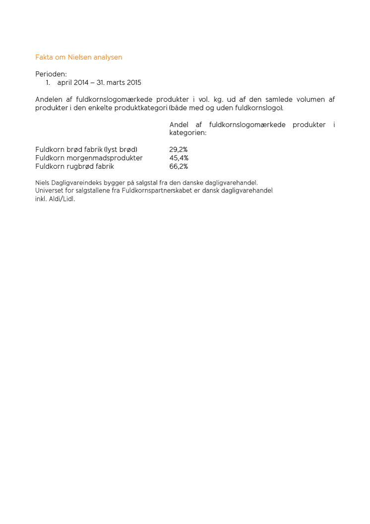 Nye tal fra analyseinstituttet Nielsen viser, at 66 procent af alle detailpakkede rugbrød, 30 procent af det lyse brød og 45 procent af alle morgenmadsprodukter, der sælges i dagligvarehandelen, nu er mærket med det orange fuldkornslogo.