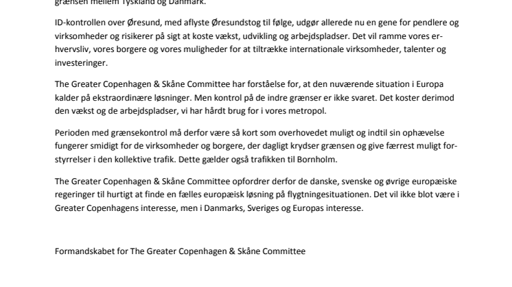 The Greater Copenhagen & Skåne Committee arbejder med at nedbryde grænserne mellem kommuner, regioner og lande. Komiteen er en politisk samarbejdsplatform for regioner og kommuner i Østdanmark og Skåne med politiske fokus på at skabe vækst og erhvervsfremme, så der skabes flere job, samt på at fjerne grænsehindringer, der udgør barrierer for vækst i regionen.