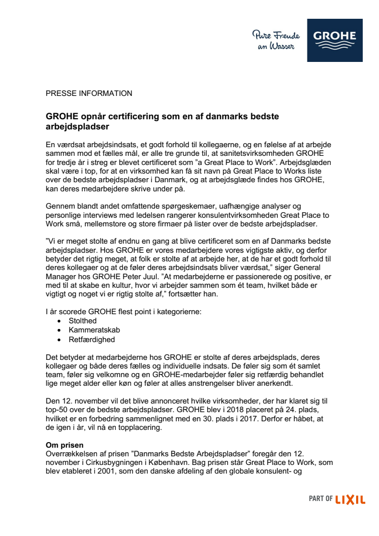 En værdsat arbejdsindsats, et godt forhold til kollegaerne, og en følelse af at arbejde sammen mod et fælles mål, er alle tre grunde til, at sanitetsvirksomheden GROHE for tredje år i streg er blevet certificeret som ”a Great Place to Work”.