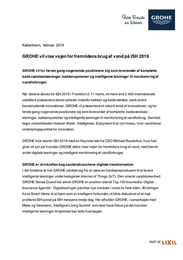 GROHE vil for første gang nogensinde positionere sig som leverandør af komplette badeværelsesløsninger, køkkensystemer og intelligente løsninger til monitorering af vandforbruget.