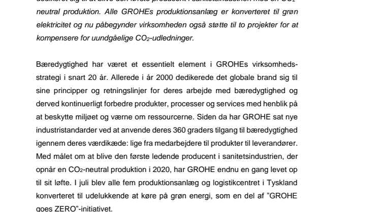 Sanitetsvirksomheden GROHE har med initiativet GROHE goes ZERO dedikeret sig til at blive den første producent i sanitetsindustrien med en CO2-neutral produktion. Alle GROHEs produktionsanlæg er konverteret til grøn elektricitet og nu påbegynder virksomheden også støtte til to projekter for at kompensere for uundgåelige CO2-udledninger.