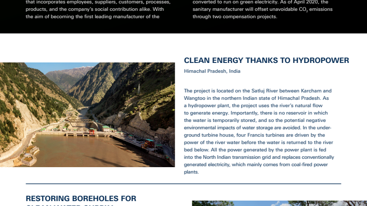 Fra april 2020 vil sanitetsfabrikanten støtte to kompensationsprojekter for at kompensere for uundgåelige CO2-udledninger: I Nordindien drives et vandkraftsanlæg, der erstatter elektricitet, som hovedsageligt kommer fra kulfyrede kraftværker. I det afrikanske land Malawi støttes et projekt, der reparerer og vedligeholder borehuller, som bruges til at udvinde drikkevand. Udover at CO2-kompensere bidrager projekterne også til en mere bæredygtig, miljømæssig og social udvikling i projekternes nærområder.