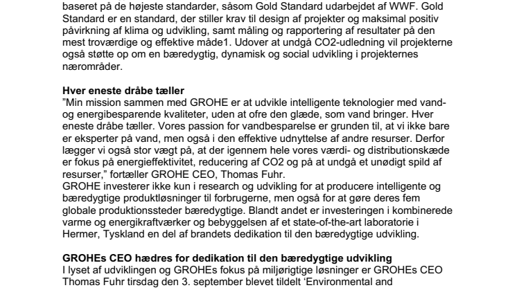 ”Min mission sammen med GROHE er at udvikle intelligente teknologier med vand- og energibesparende kvaliteter, uden at ofre den glæde, som vand bringer. Hver eneste dråbe tæller. Vores passion for vandbesparelse er grunden til, at vi ikke bare er eksperter på vand, men også i den effektive udnyttelse af andre resurser. Derfor lægger vi også stor vægt på, at der igennem hele vores værdi- og distributionskæde er fokus på energieffektivitet, reducering af CO2 og på at undgå et unødigt spild af resurser,” fortæller GROHE CEO, Thomas Fuhr.