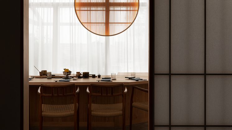Når man kommer indenfor, taler indretningen, råvarerne og gastronomien for sig selv og fortæller en historie om fusionen mellem det danske og det japanske. Spisepindene er af sort ibenholttræ håndlavet af en japansk familie. Spisebaren, hvor de otte spisende gæster sidder, mens Mads Battefeld serverer ét stykke sushi ad gangen, er bygget af Douglasgran, der blev plantet som det første af sin art i Danmark i 1868. Den friske wasabi kommer fra ekspert-området Shizuoka i Japan og bliver revet på ægte hajskind. Og toiletinstallationen er et Sensia Arena, et Japansk skylletoilet fra GROHE, der leder tankerne tilbage til Japan.