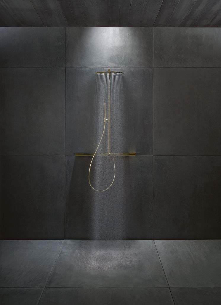 AXOR Showerpipe 800 passer perfekt til AXOR Uno med sit cylindriske design. Her i overfladen poleret messing, der også er standard for AXOR Uno produkterne.